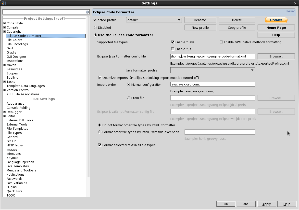 - Import the code styling xml that is part of the ovirt-engine project: ovirt-engine/config/engine-code-format.xml
