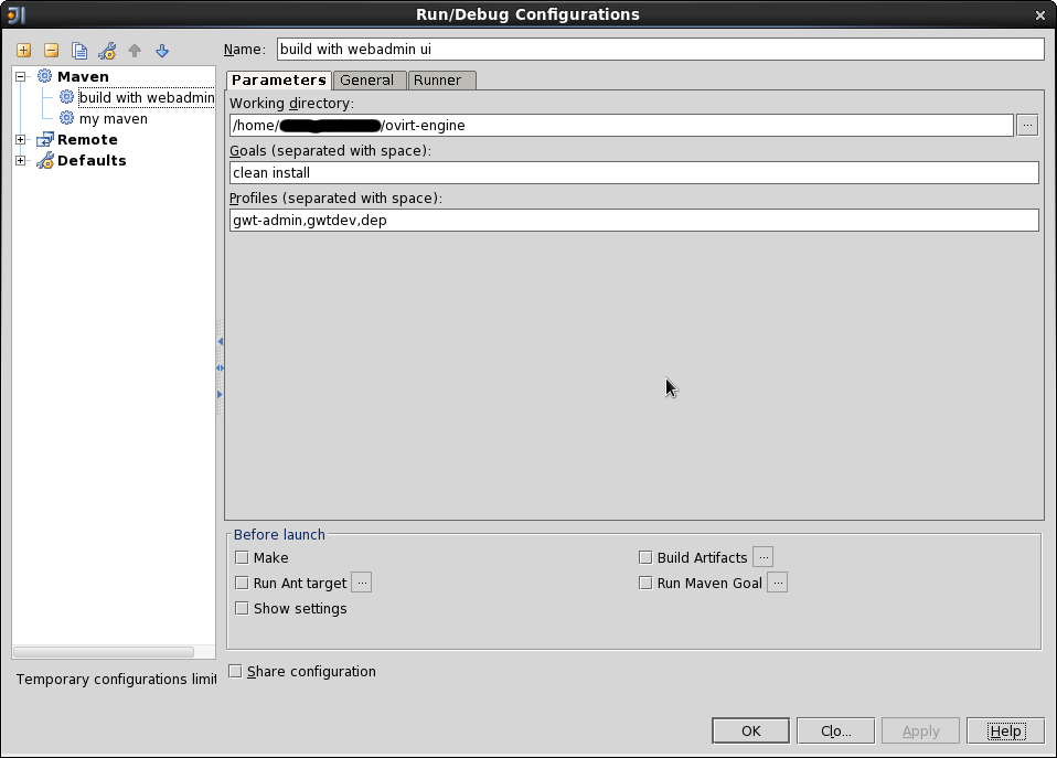 Now you can always select this configuration from the combo box in the main pane, and press “run” (the green triangle) - it is equivalent to running “mvn clean install … “ from the command line.