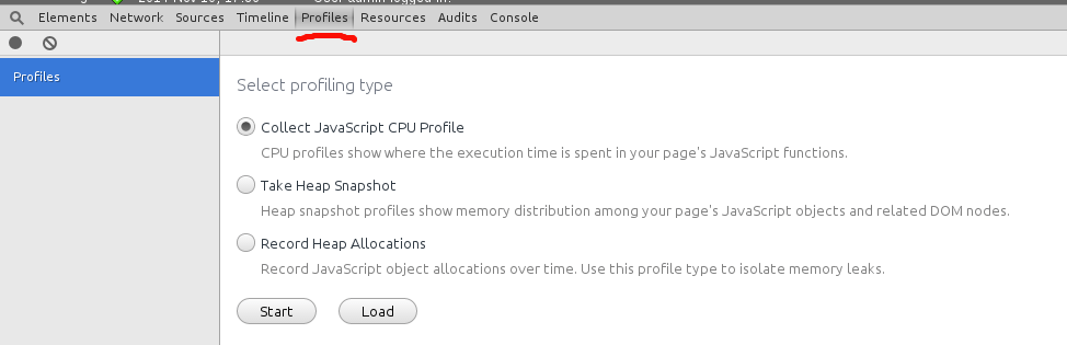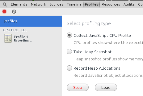 Start Chrome and hit F12. Click the Profile tab. Since we’re debugging JavaScript performance, we’ll use Collect JavaScript CPU Profile.