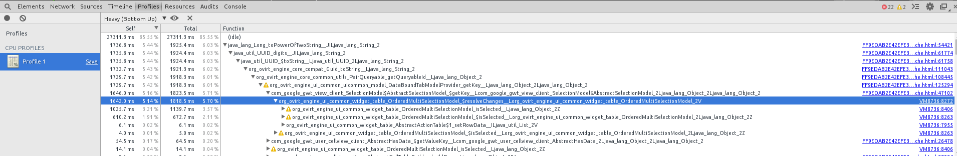 When running my example, the browser hung for about 2 seconds. Looking at my profiler data, it looks like the JavaScript engine spent a lot of time in the functions named “isSelected”, “resolveChanges”. The root cause appears to be a slow “toPowerOfTwoString” function.
