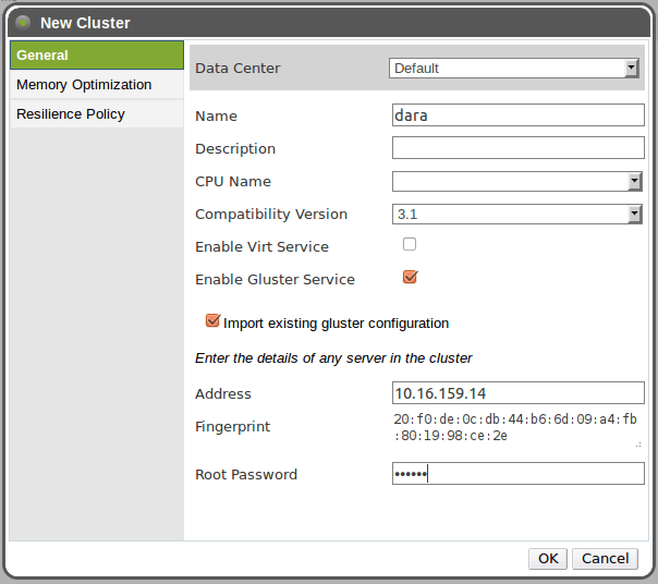 - Select Enable Gluster Service and Import existing gluster configuration checkboxes.