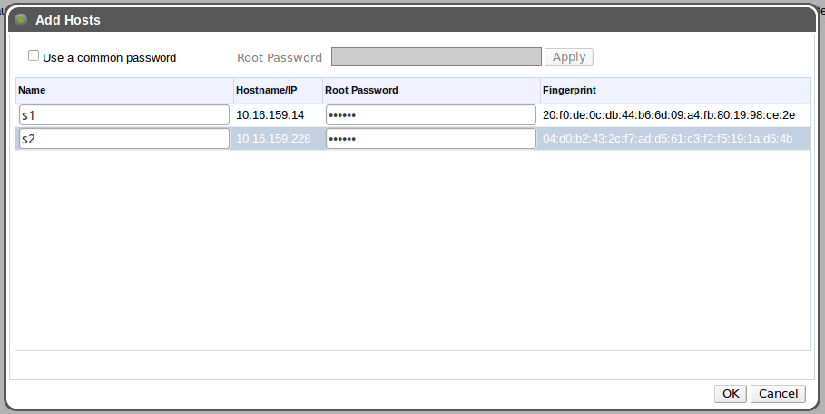 - Edit the Name of the hosts if required and provide Root Passwords. Same password can be provided for the all the hosts by selecting Use a common password. Click on Apply to set the entered password all hosts. The user can provide a different password for one host by editing the Root Password field of the respective host.