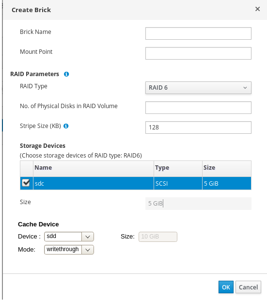 Gluster bricks are directories on the server with a local filesystem that supports extended attributes. While provisiong bricks from oVirt engine, an xfs filesystem is created on logical volumes as per best practices. While creating bricks on SSD devices would be ideal for performance, this is often not practical due to cost factors. In such cases, on servers that have smaller SSD devices, an lvmcache can be used to improve the performance of the slower LV housing the gluster bricks.