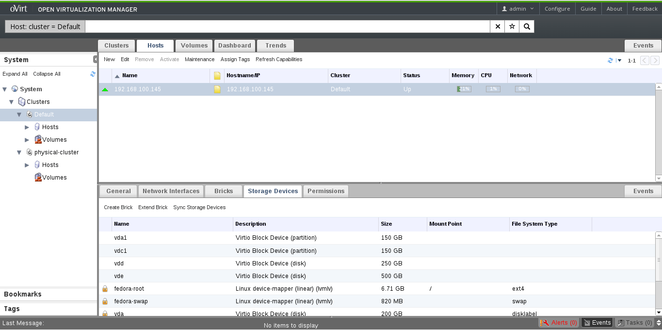 There will be a new sub tab with name “Storage Devices” will be added under the Hosts tab. This tab will list all the storage devices in the hosts. All free storage devices which can be provisioned to use in gluster volume will be shown in the top of the list, remaining storage devices which are already used will be shown with a lock symbol in the begging of the column as in the below screen shot.