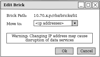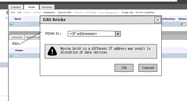 - Provide an edit brick - where user can pick an IP address. This will call the “replace-brick commit force”. Disruption in service may occur for distributed volumes as the brick process will be restarted. For replicated volumes, there might be a performance degradation.