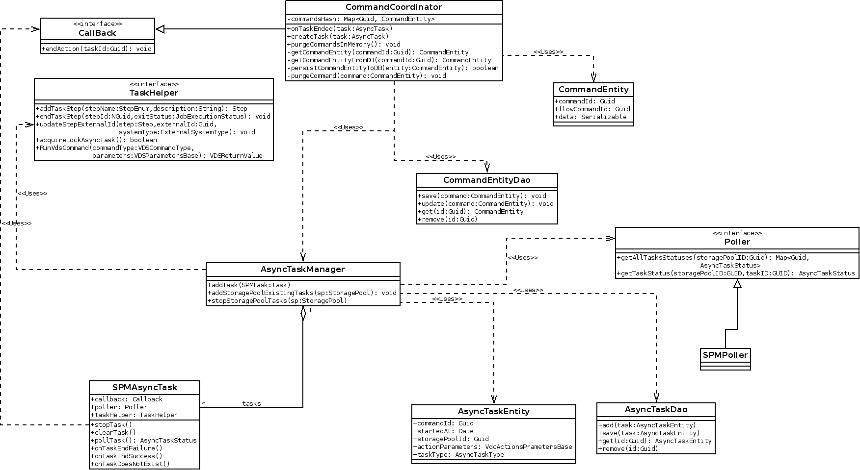 - Poller : A new interface Poller with methods for returning the status of tasks. SPMPoller implements this interface and returns statuses by calling RunVdsCommand.