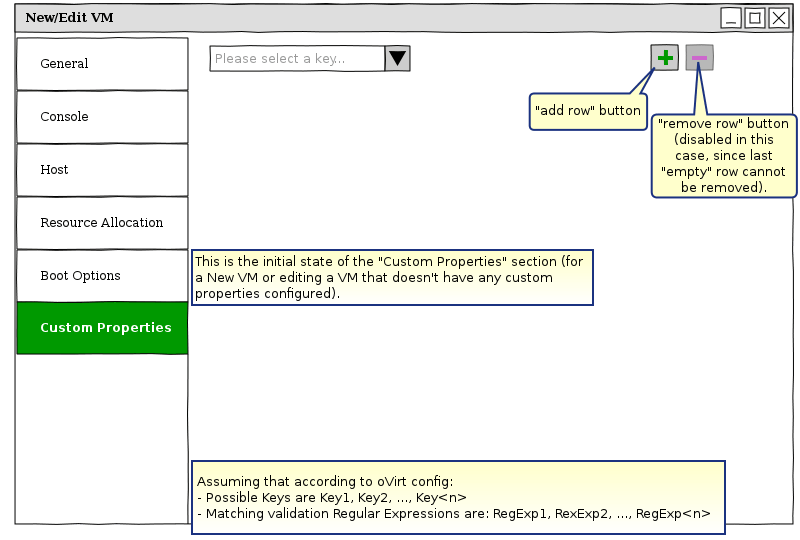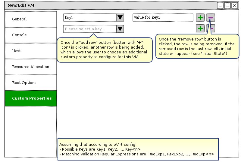 The Custom Properties for a VM are edited in the GUI via the “Custom Properties” section within the New/Edit VM dialog. Currently this section contains a plain text-box, which should be filled according to a very specific format. In order to improve user experience, we want to beautify the “Custom Properties” section.