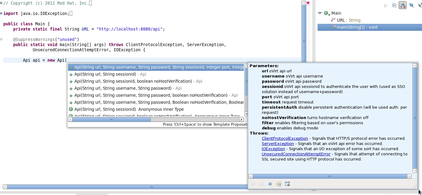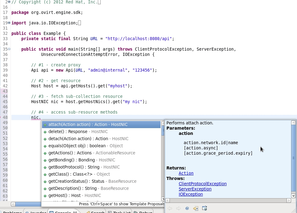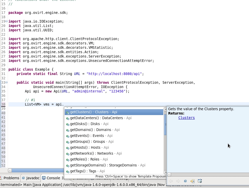 <dependency> <groupId>org.ovirt.engine.sdk</groupId> <artifactId>ovirt-engine-sdk-java</artifactId> <version>x.y.z.q-v</version> <type>jar</type> <scope>compile</scope> </dependency>x.y.z.q-vis a latest sdk release (list of available releases can be found at Java SDK tags) - deploy sdk dependencies and javadoc