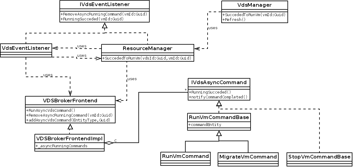 - Commands which implements the IVdcAsyncCommand interface - triggered by VDSBrokerFrontendImpl.RunAsyncVdsCommand, the command instance is maintained with its context and finalized by the monitors (VdsUpdateRuntimeInfo).
