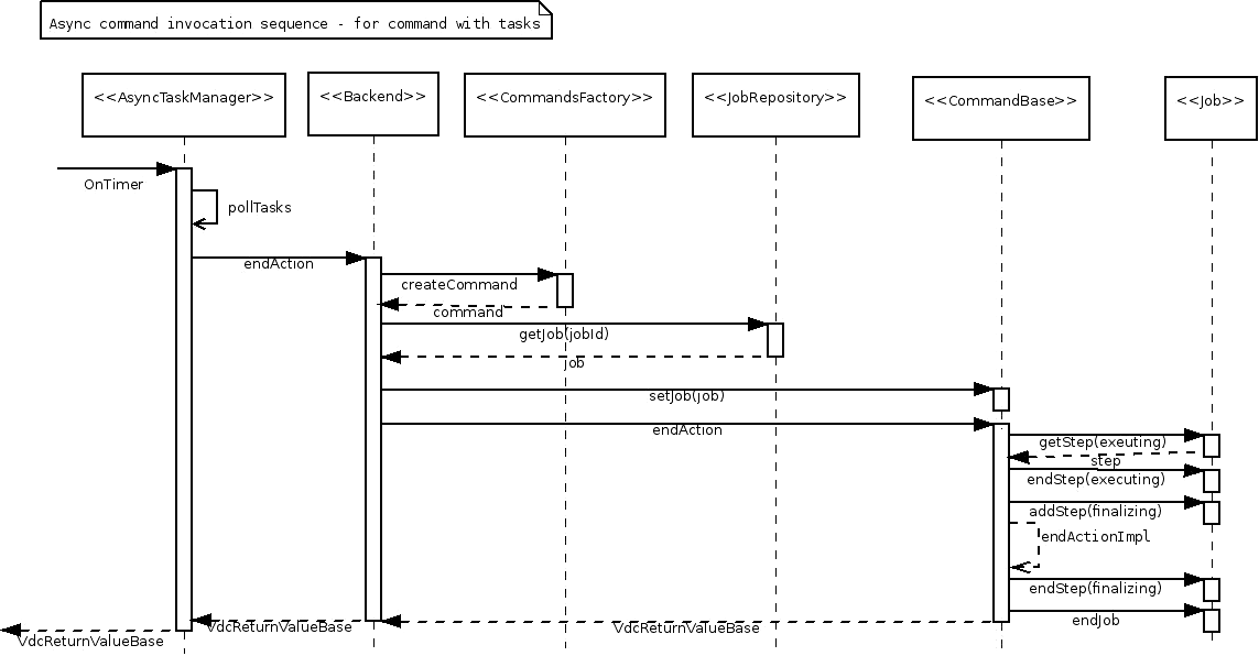 - A command with VDSM tasks - a command which consists of 3 steps: validation (CanDoAction), execution and finalization (endAction).