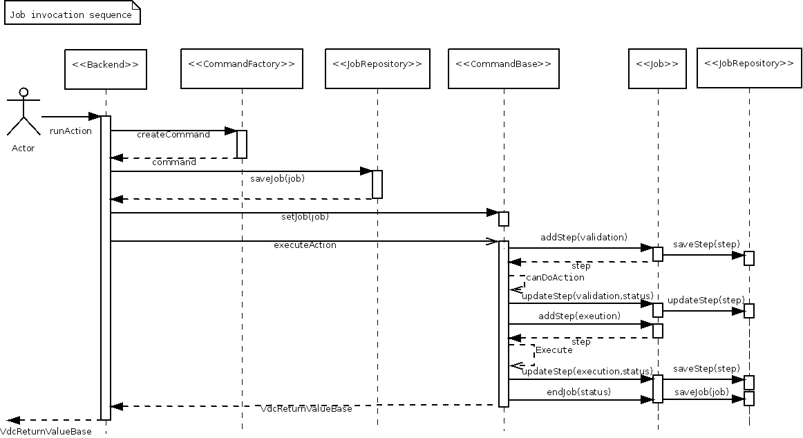 - Job An entity which encapsulates a client action in the system. The Job contains a collection of steps which describes portions of the entire Job. A Job contains all of the information required for defining and running the client action: Using Job entity a concrete instance of CommandBase(Job’s main command) could be created (by action type and parameters). The Job entity also capable to produce a descriptive tree of steps, reflecting the action parts to be delivered to UI for presentation.