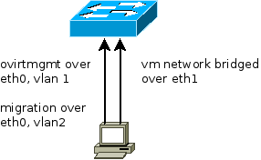 One oVirt 3.3 feature that could specifically benefit from host-level QoS is Migration Network, which enabled to designate a specific network to be used for VM migration, to avoid burdening the management network. For the management network to continue functioning properly, it would likely have to be attached to a different network interface on the host, otherwise migration-related traffic could easily lead to congestion. Being able to configure network QoS on the host level means that these two networks could now reside on the same physical NIC without fear of congestion, as can be seen in the diagram above.