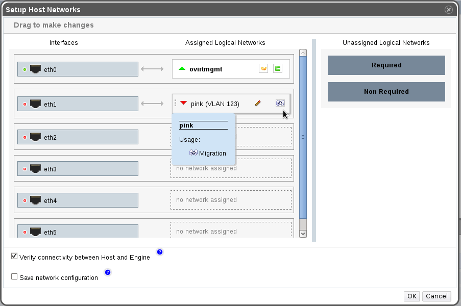 - One NIC should be used by the management network, and the other - by the migration network. Use the new GUI to configure your hosts appropriately.