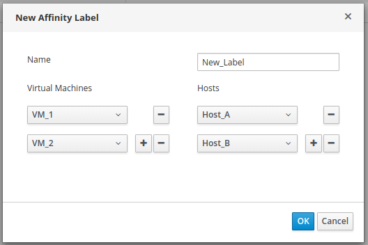 Existing affinity labels can be added to VMs and hosts from the “Affinity Labels” side tab of their respective new/edit popup dialogs.