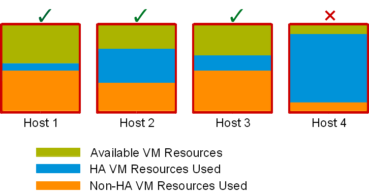 To illustrate: In the following diagram, we note that Hosts 1, 2, and 3 should all be able to failover their HA VMs successfully to alternate hosts within the cluster, whereas there simply isn’t enough available capacity across Host 1, 2, and 3 for the HA VMs in the event that Host 4 fails.