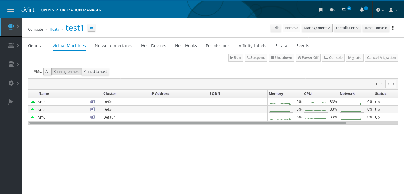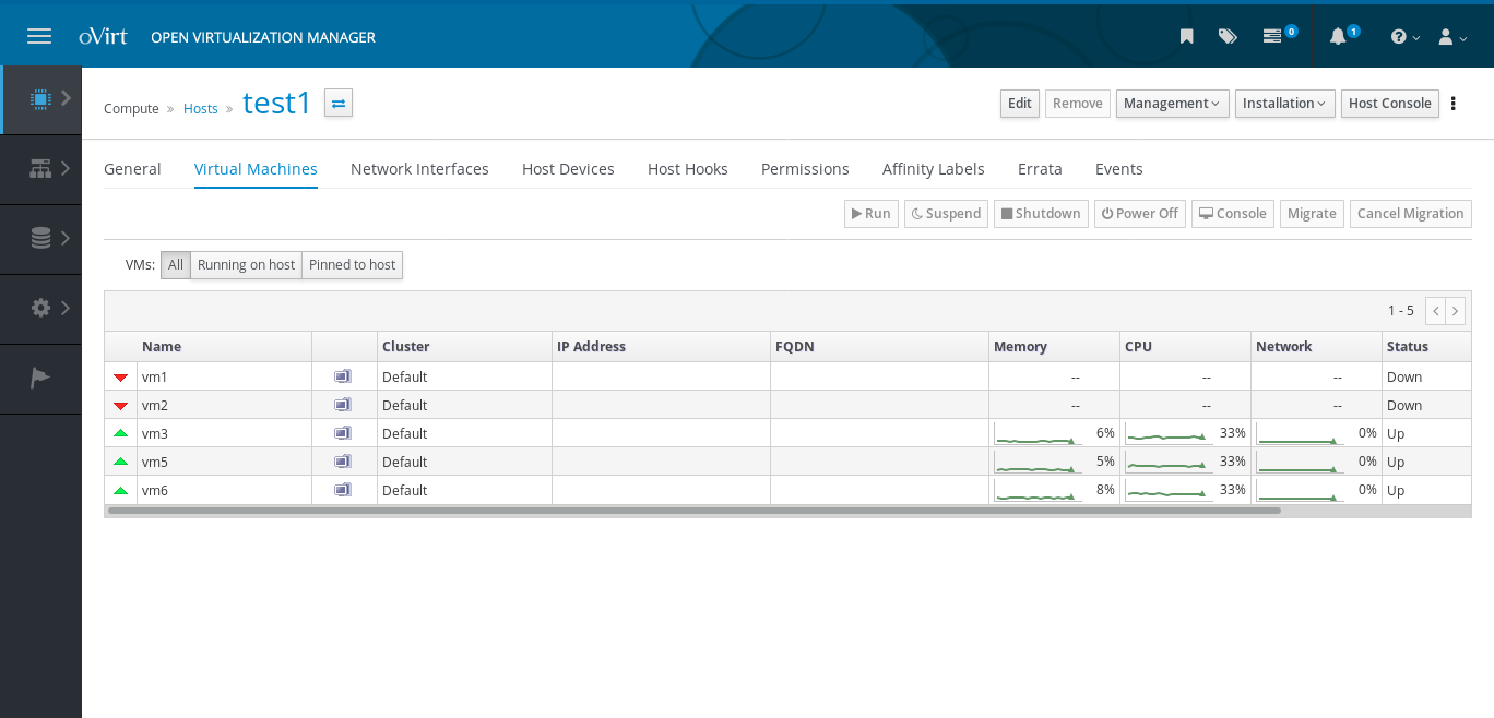 The table in the Virtual Machines detail tab of the Host entity shows