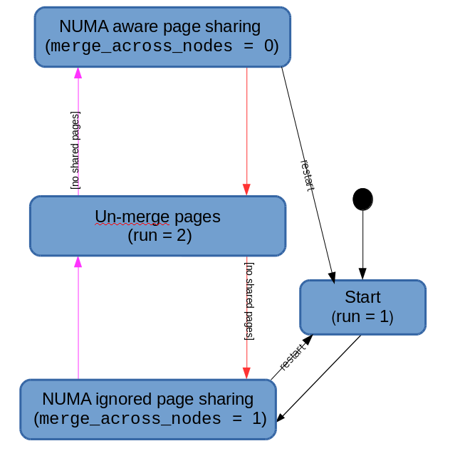 - Host administrator’s manual configuration for /sys/kernel/mm/ksm/merge_across_nodes kernel flag. Is effective till next MoM collection cycle (important for manually trials and testing).