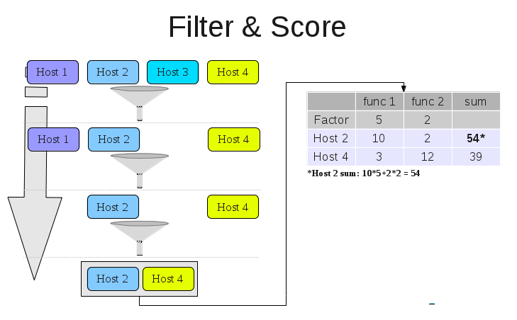 - Ultimately, using the filtered hosts, cost functions and factors, we will construct a cost table (see figure), which will order the hosts (we will try to run the VM on the first host, then second and so-forth).