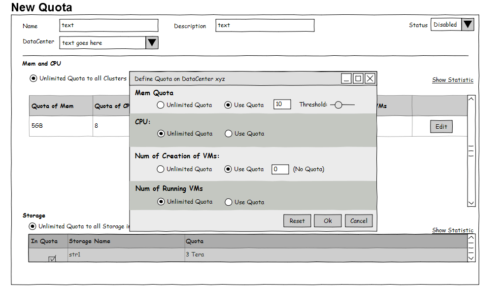 Today, when consuming resources from the Data Center, such as storage (when creating a new virtual disk) and virtual CPUs/RAM (when running VMs), the user is only limited by the available resources. Thus, there is no way to limit the resources that can be used by a user. This limitation is problematic, especially in multi-tenant environments.