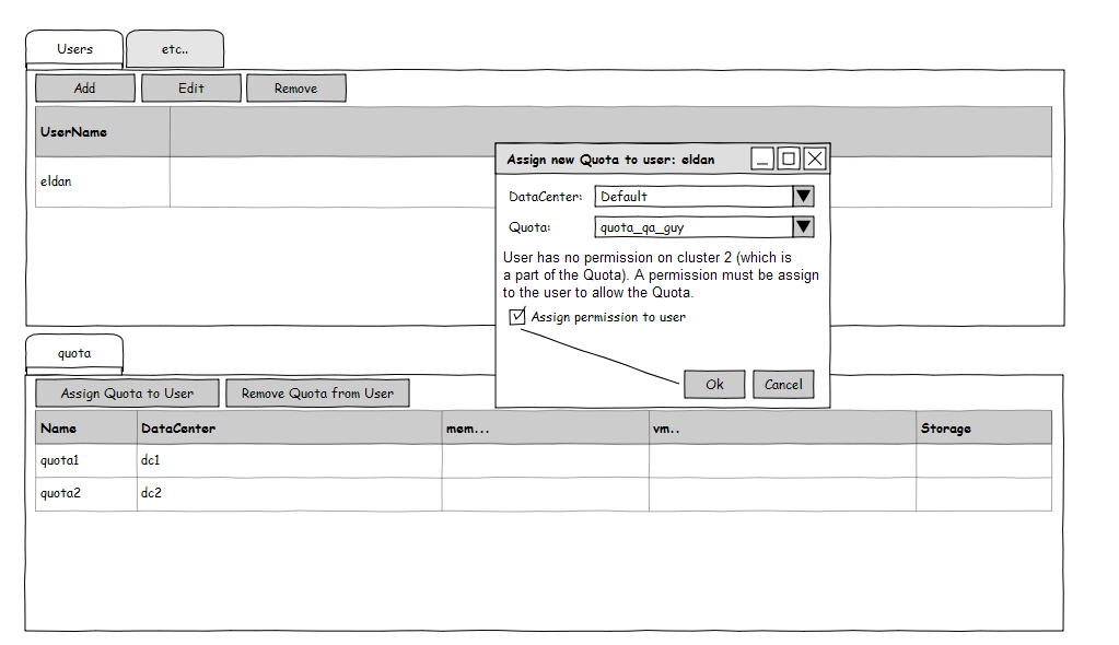 - Users assigned to the Quota would need a power user permission on the consumable resources (for example when add/edit a VM). The wizard should enable automatic addition of these permissions. However, no permissions will be removed when removing resources from the Quota, but an alert message will be presented as follow: