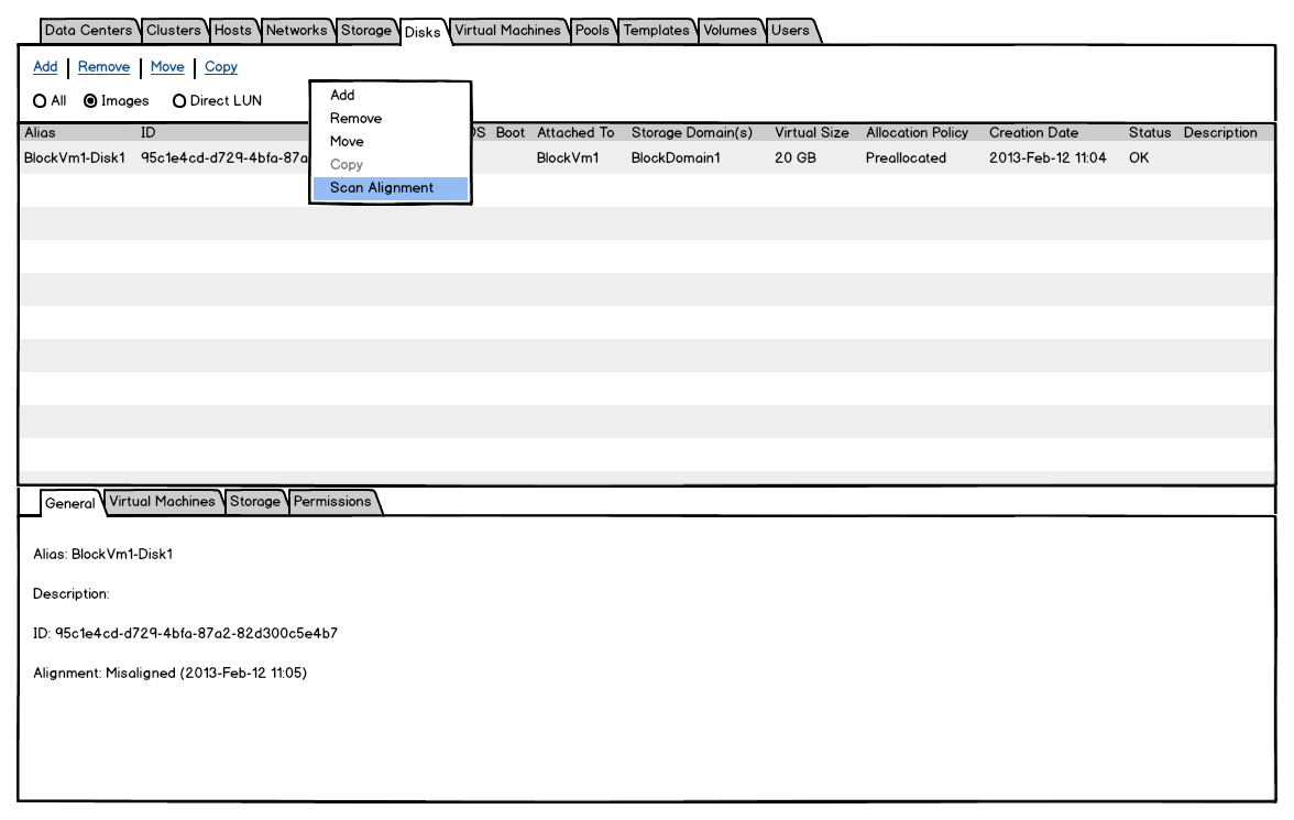 This page describes the Disk Block Alignment feature. The main scope of this feature is to provide a way in oVirt to find the virtual disks with misaligned partitions. For more information on this matter please refer to the virt-alignment-scan tool.