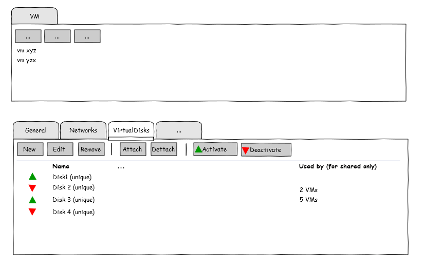 The following UI mockup contain guidelines for VMs->Disks sub-tab: