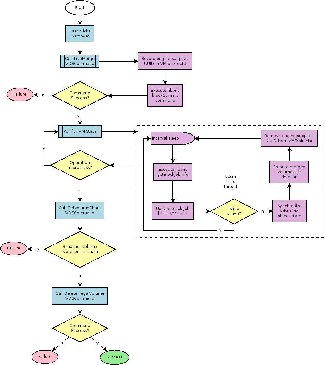 The user presentation of the live merge feature is simple - the only noticeable change is that the ‘Remove’ snapshot command is no longer disabled when a virtual machine is running. Behind the scenes, however, the flow is quite complex. Live merge is an asynchronous operation, and maintaining the consistency of management meta data and actual virtual machine storage requires delicate handling of many different error scenarios. The following is a detailed description of the flow and processes that need to be in place on both the engine and on VDSM. See the flow diagram below for a graphical overview of the processes.