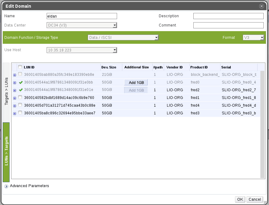 In the “Edit Domain” window, a new column “Additional Size” will be available. If the LUN can be expanded , a toggle button with the additional size available will appear in the column. The user can choose to select the button on the LUN he wants to refresh and then click OK.