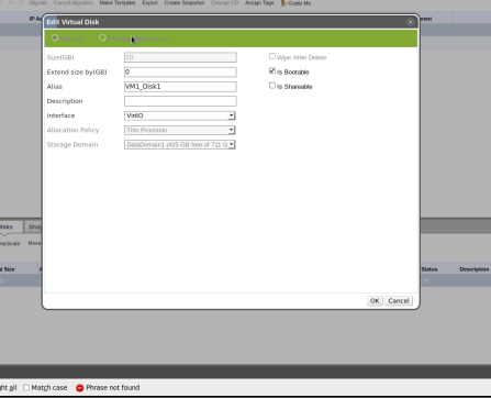 - Click on “Edit”, pay attention that if disk is locked or VM has other status than “UP”, “PAUSED”, “DOWN” or “SUSPENDED”, editing is not allowed so “Edit” option is grayed out.