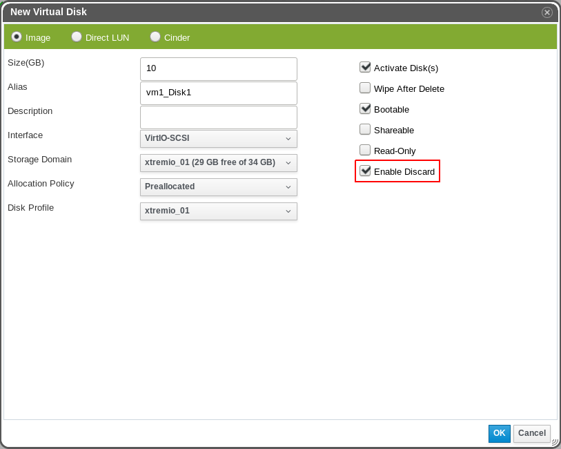 It is possible to enable Pass Discard for two disk storage types: Images and Direct LUNs.