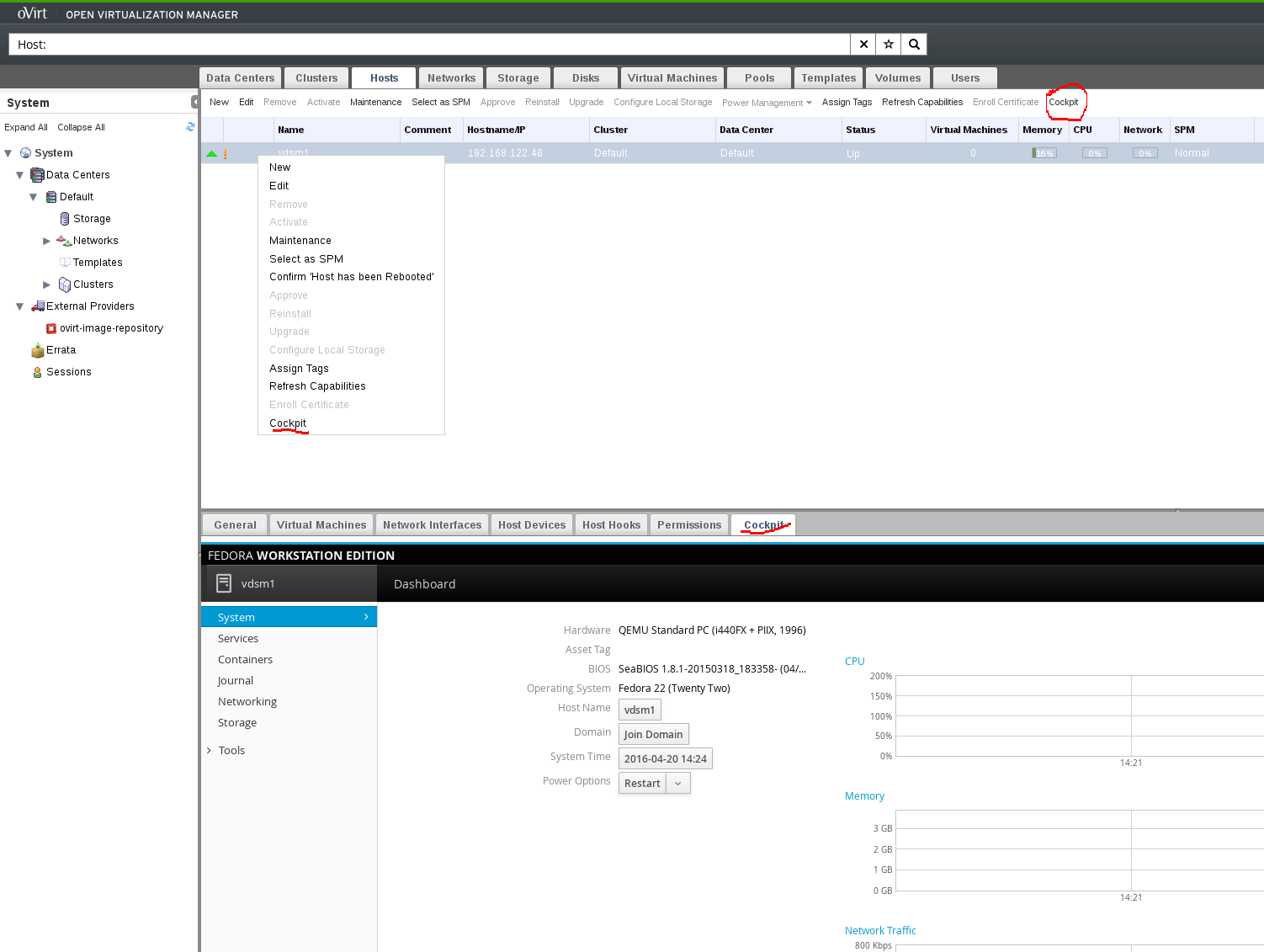 With this plugin, the host main-tab shows a new subtab embedding Cockpit which is running on the selected host. The host’s right-click menu is enriched for new ‘Cockpit’ action leading to opening new browser window/tab with the host’s Cockpit.