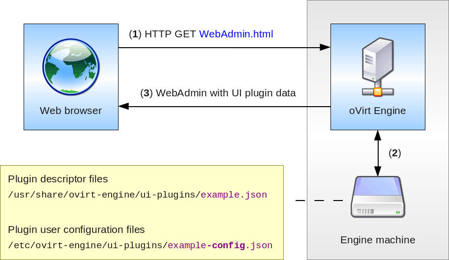 As part of handling WebAdmin HTML page request (1), UI plugin infrastructure attempts to discover and load plugin descriptors from local file system (2). For each descriptor, the infrastructure also attempts to load corresponding plugin user configuration used to override default plugin-specific configuration (if any) and tweak plugin runtime behavior. Note that providing plugin user configuration is completely optional. After loading descriptors and corresponding user configuration files (if any), oVirt Engine aggregates UI plugin data and embeds it into WebAdmin HTML page for runtime evaluation (3).