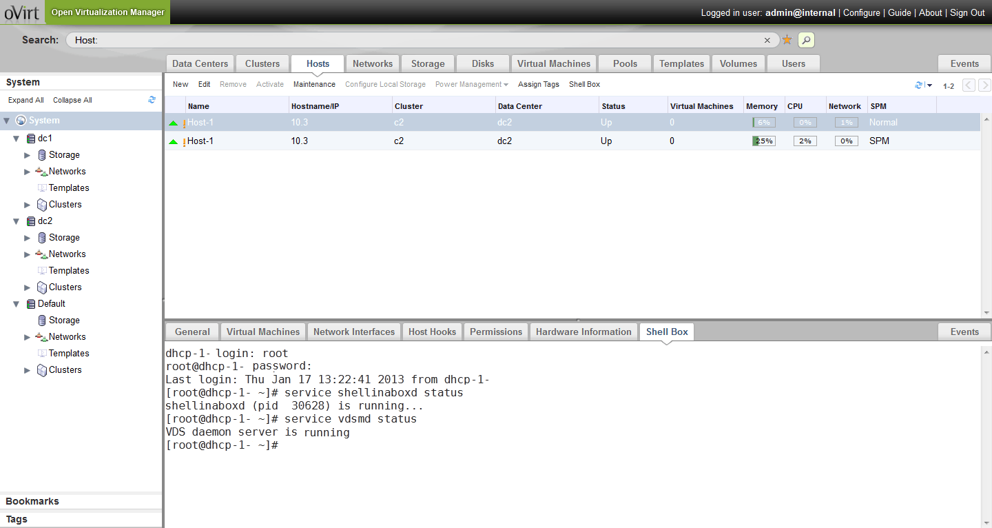 Using oVirt WebAdmin, make SSH connection to a host and emulate a terminal via Shell In A Box.