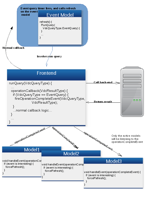 The problem is something besides the interactions of the user with the UI has made changes to a model or a set of models on the back-end and the front-end doesn’t know about these changes. Interactions by the user are captured by the ‘action solution’ above. Some/all of those changes generate an event which is retrieved using a periodic event query. This event query is not in sync with the rest of the normal model queries. So we can get a situation where an event is reported in the event log but the associated UI elements have not been updated yet.