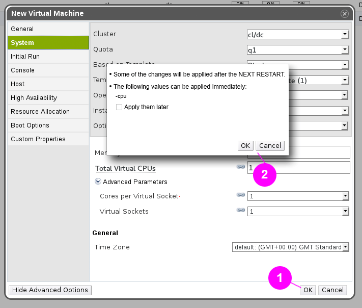 If change affect running vm, and require special operation (like hot-plug cpu), the user could select if to apply immediately or only on the next run.