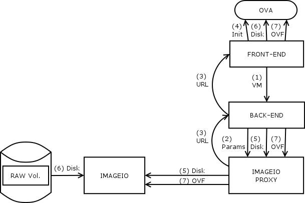 - The back end asks VDSM to create an OVA file with the complete OVF specification and export destination.