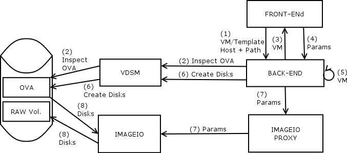- vdsm runs the ova-ovirt tool that reads the disks from the OVA and according to the import parameters streams the data into the corresponding target disks.