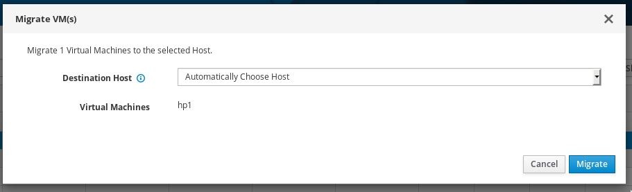 When a user will chose to migrate the HP/pinned VM, he will need to manually activate the migration (click “Migrate” on the VMs tab) and then via the “Migrate VM(s)” popup dialog to choose the destination host to migrate to, or let the engine to auto select it for him. This is the same as done for all other VM types.