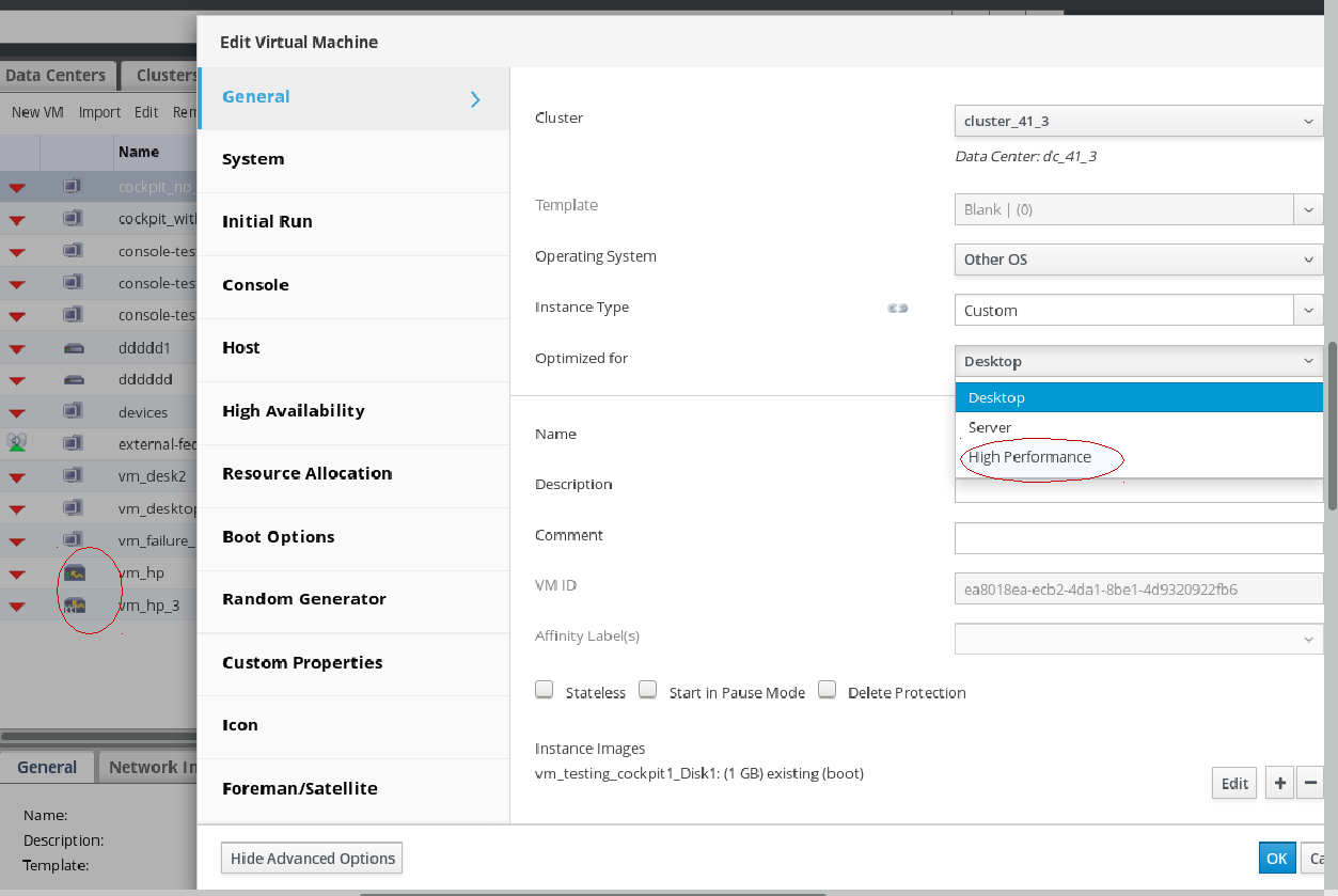 Setting a VM to run as a High Performance VM can be done to a new or existing VM via UI by selecting the “High Performance” type in the “Optimized for” pull down menu field displayed in VM new/edit dialog. This new VM type is added in addition to already existed VM types: “Server”, “Desktop”.