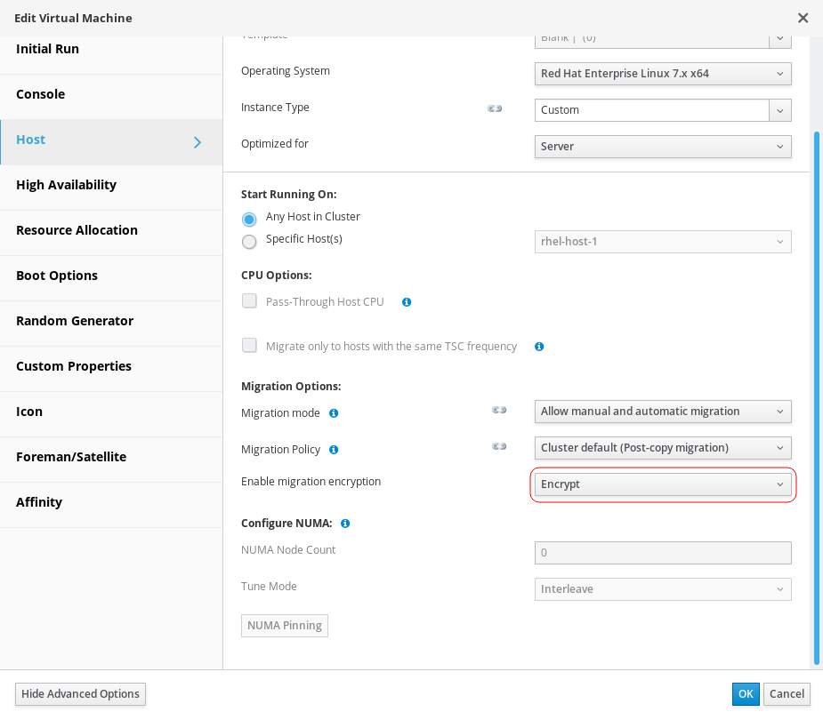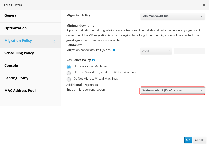 There is new “Enable migration encryption” option in Migration Policy tab of the cluster edit dialog. It’s possible to enable or disable encrypted migrations there or to use the system default, which is not to encrypt migrations currently.