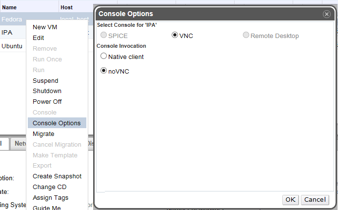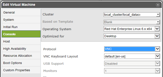 - Select or create a VM. While editing it, under console set its Display Type to VNC. Save and start the VM.