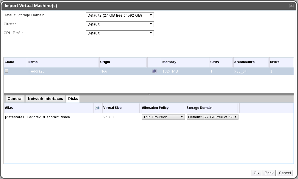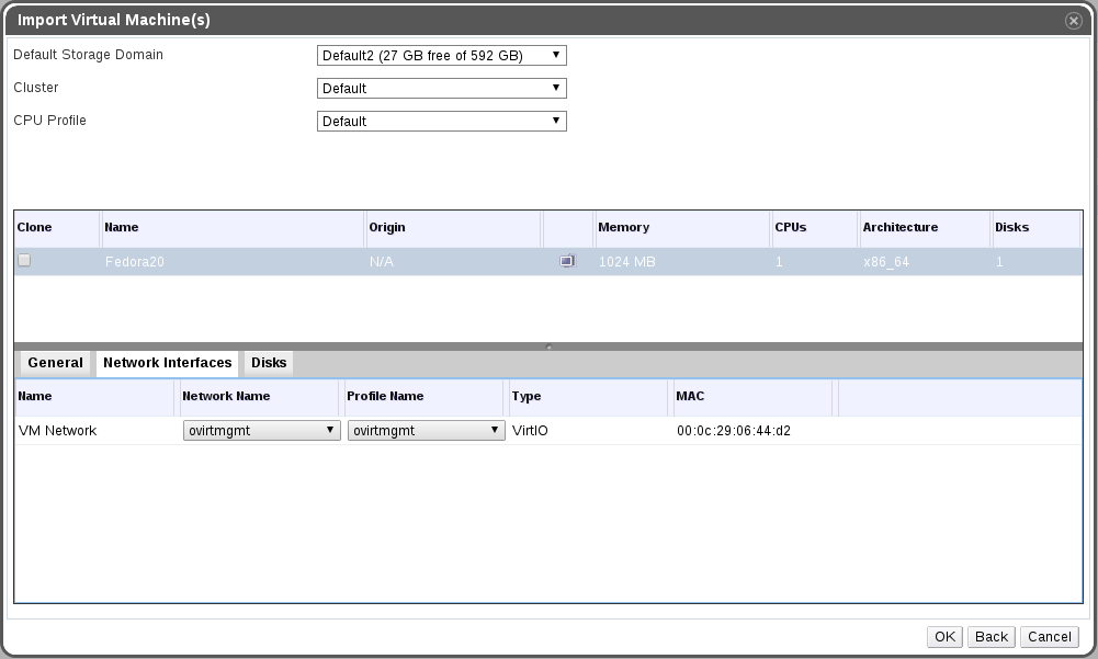 The next dialog shows a list of the selected VMs from the previous dialog with general settings such as default storage-domain and CPU profile along with a configuration per-VM (this dialog is similar to the one which is used when importing from an export-domain).
