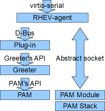 - The RHEV-Agent receives the user’s credentials from the VDSM through the virtio-serial device