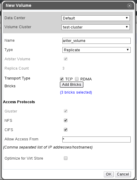 Volume Type field in the General sub tab will be changed to Replicate (Arbiter) in case of Arbiter volume.