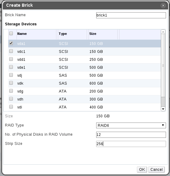 There will be a ‘Create Brick’ action available in the storage device sub to create bricks. This opens the following pop up so that user can choose the storage device with which he wants to create Brick.