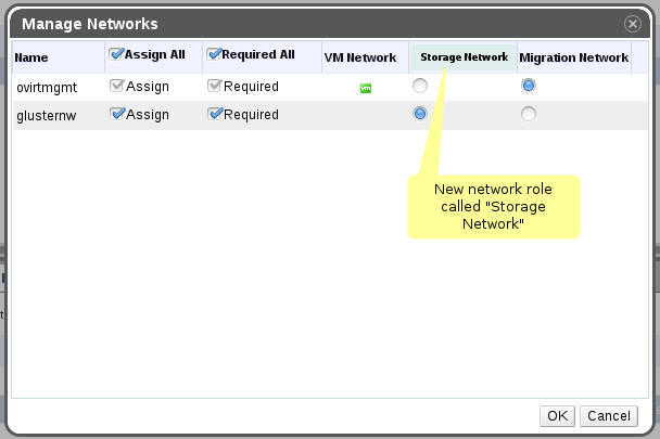 - If the host has no interface with network role “Storage network”, the host’s address is used. This will also cater to the usecase, where users want to continue using the host FQDN to add bricks. (Users may have DNS setup to resolve host name correctly based on internal/external networks)