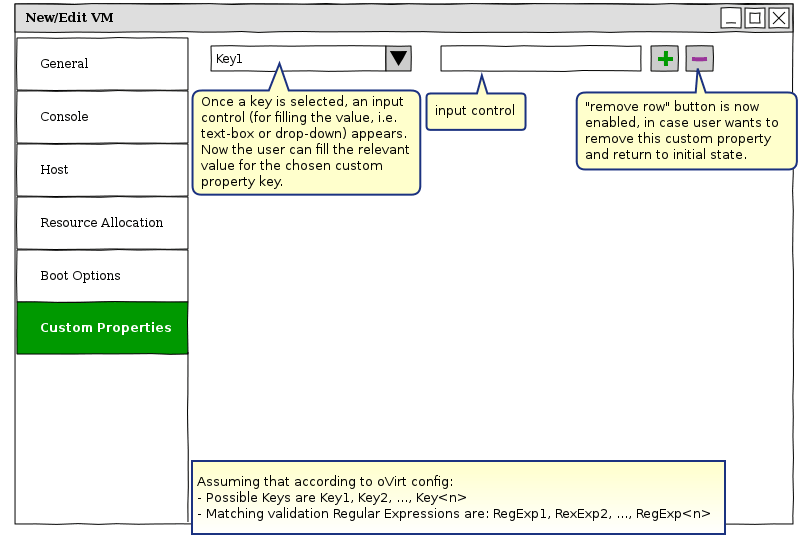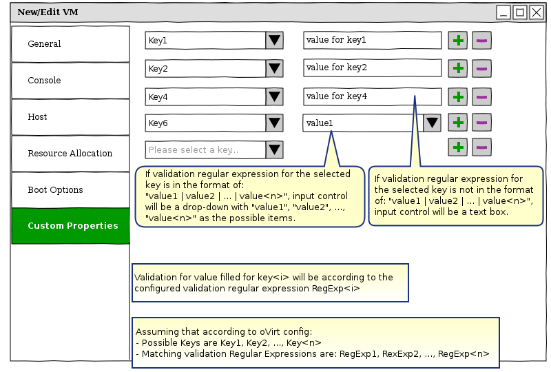 The Custom Properties for a VM are edited in the GUI via the “Custom Properties” section within the New/Edit VM dialog. Currently this section contains a plain text-box, which should be filled according to a very specific format. In order to improve user experience, we want to beautify the “Custom Properties” section.