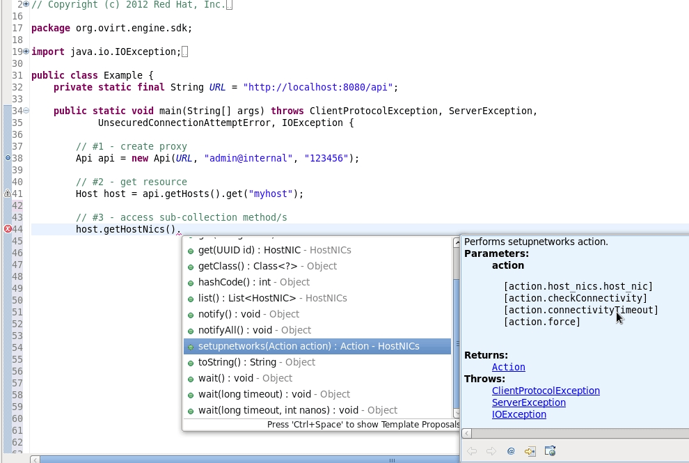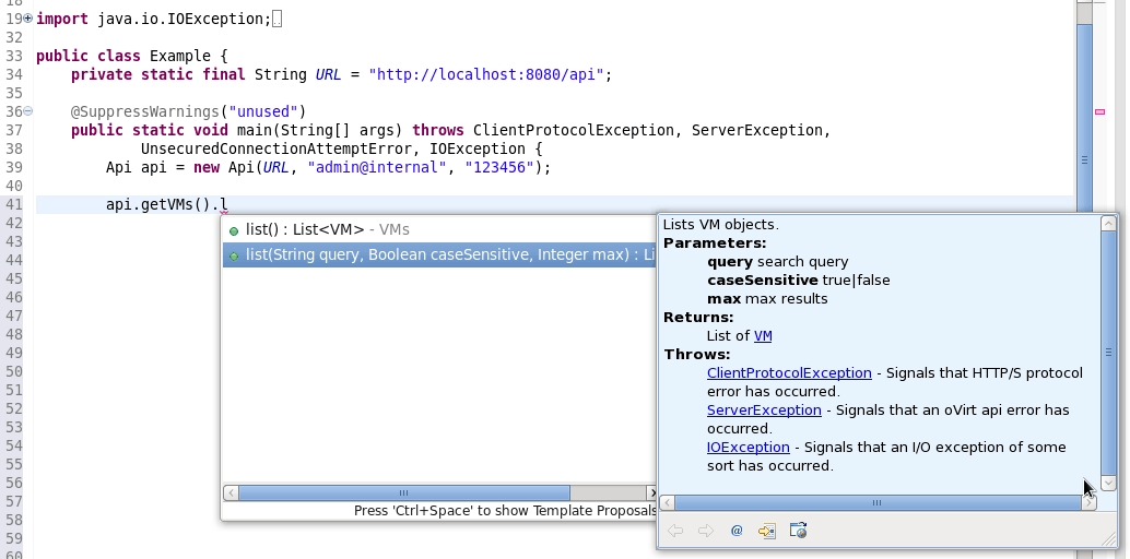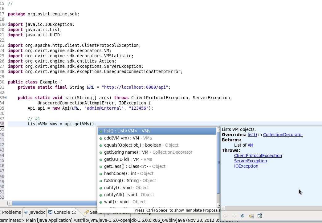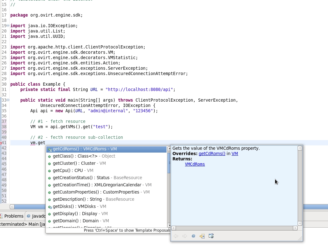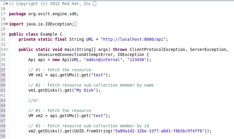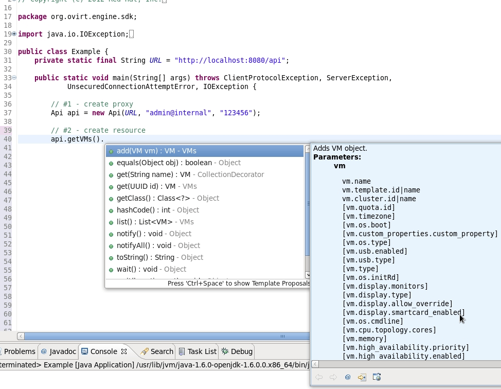 <dependency> <groupId>org.ovirt.engine.sdk</groupId> <artifactId>ovirt-engine-sdk-java</artifactId> <version>x.y.z.q-v</version> <type>jar</type> <scope>compile</scope> </dependency>x.y.z.q-vis a latest sdk release (list of available releases can be found at Java SDK tags) - deploy sdk dependencies and javadoc