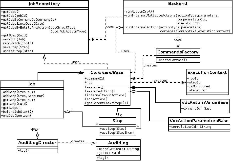 By default, internal commands won’t be presented as Steps of the Job, unless specified. Therefore the job description of a command which invokes internal commands is the same as the default one (or the one above if the main command has tasks). The only exceptions is commands which invoke internal commands which create VDSM tasks. In that case the default behavior will be to add only the VDSM tasks as steps under the Job EXECUTION step. It is possible to override this behavior either for not presenting internal commands VDSM tasks or for specifying other Step to which the VDSM tasks of the internal command should appear for.