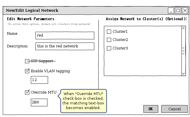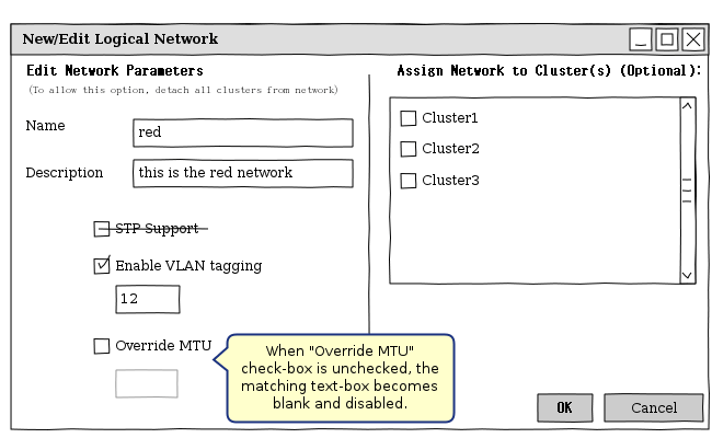 - mtu is updateable only when the logical network is not attached to a cluster